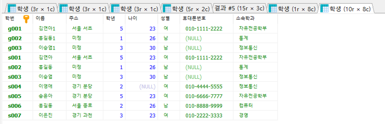 VALUES ('홍길동1', DEFAULT, 1, 26, '남', NULL, '통계', 'g002');