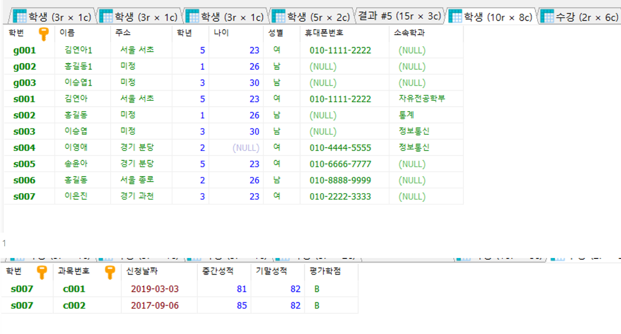 SELECT * FROM 수강 WHERE 학번='s003' OR 학번='s007';