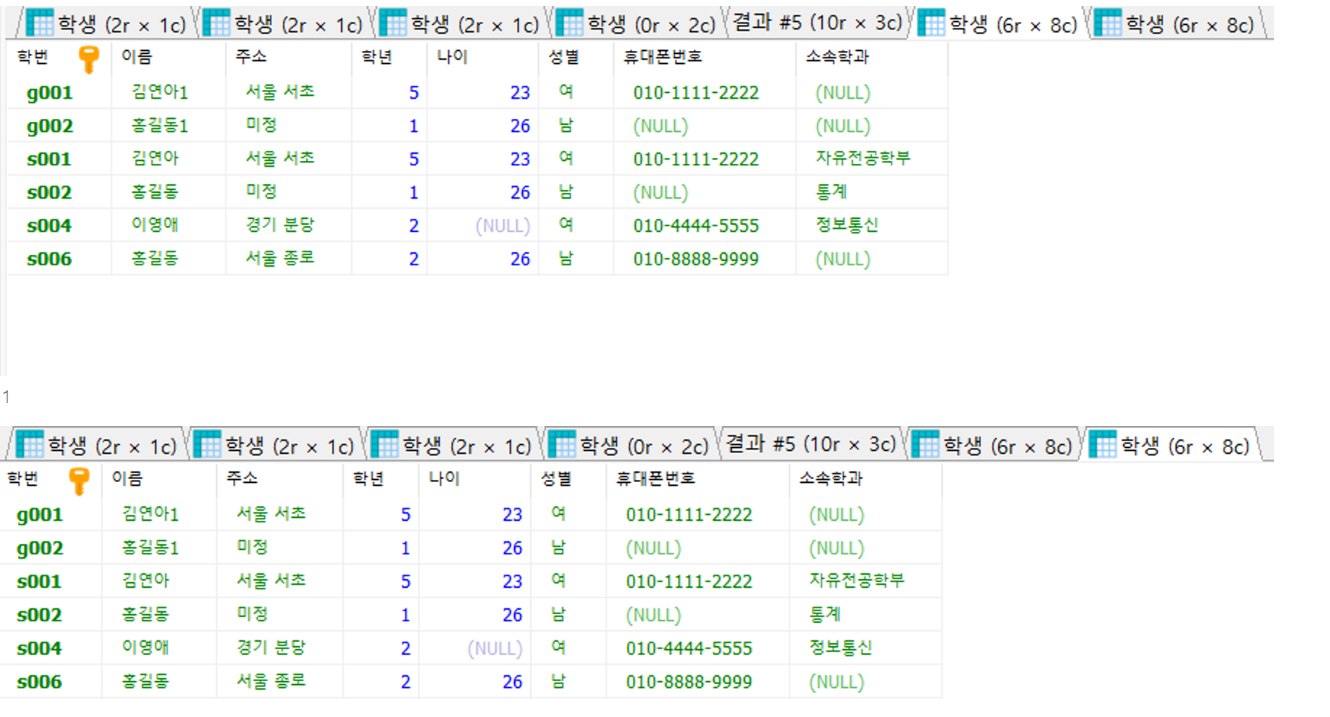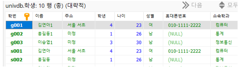 VALUES ('홍길동1', 1, 26, '남', '통계', 'g002'); # 위의 쿼리나 이 쿼리를 이용하면 됨
