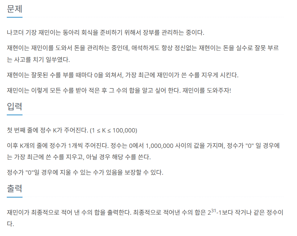 첫 번째 줄에 정수 K가 주어진다. (1 ≤ K ≤ 100,000) 이후 K개의 줄에 정수가 1개씩 주어진다. 정수는 0에서 1,000,000 사이의 값을 가지며, 정수가 "0" 일 경우에는 가장 최근에 쓴 수를 지우고, 아닐 경