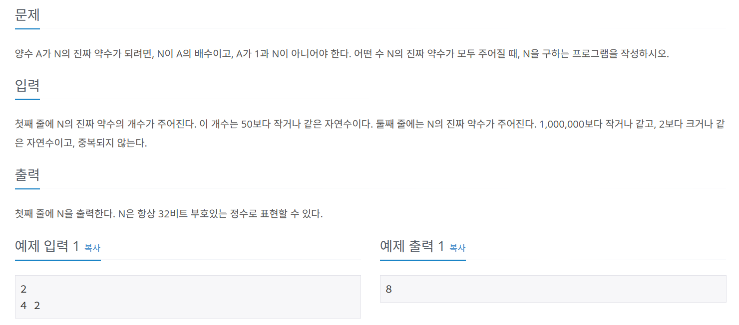첫째줄에 약수의 개수가 주어지고, 둘째줄에 약수가 주어지면 이에 대한 연산을 진행하는 문제였다.