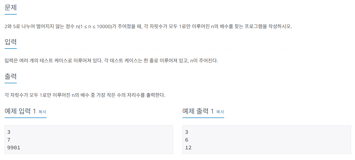 이 문제 1의 경우 일단 입력받은 n의 배수 중 모든 자리수가 1인 경우, 즉 11, 111, 1111 이런 수들을 의미한다.