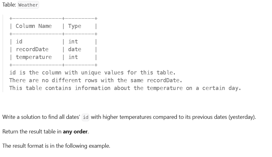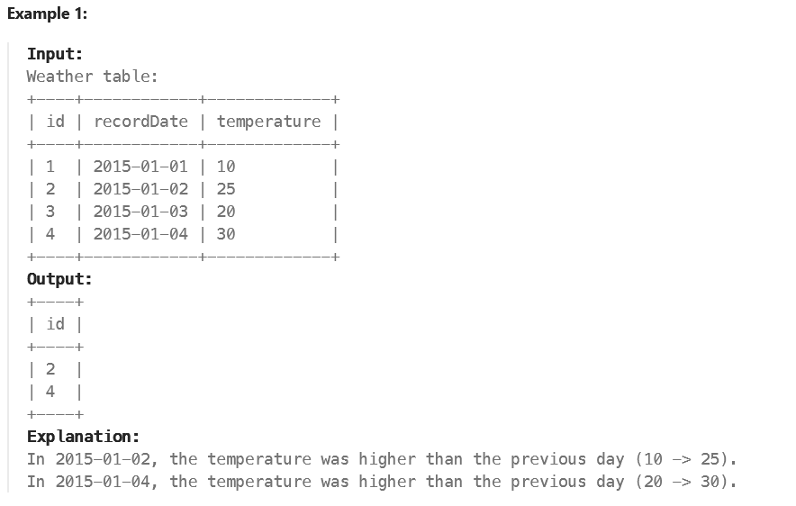 datediff는 두 날짜를 입력받아 몇일 차이나는지 반환해주는 함수로 바로 전날이라는 것을 확인하기 위해서는 return 값이 1이 나와야 할 것이다. 이 사실을 활용해 어제와 오늘의 기온을 비교하여 id를 반환하면 해결 할 수 있는 것