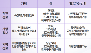 l 데이터 3법(개인정보 보호법, 정보통신망법, 신용정보법) 개정안을 통해 개인정보 보호법에서 가명정보 소개. 가명정보는 개인 동의 없이 통계작성, 연구, 공익적 기록 보존 목적으로 사용 가능.