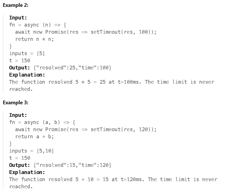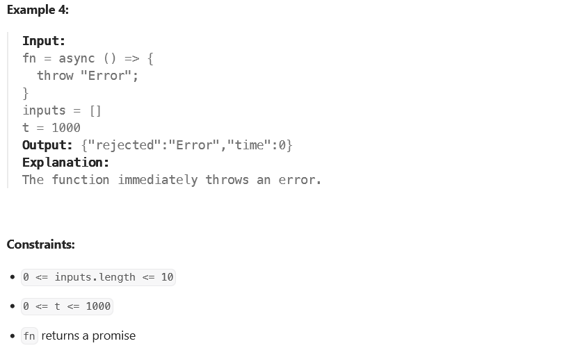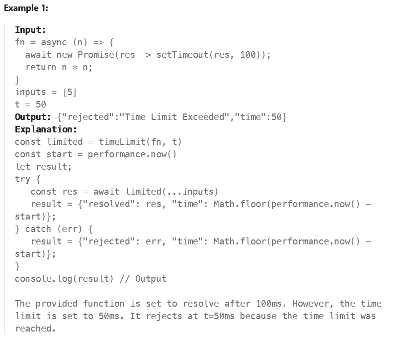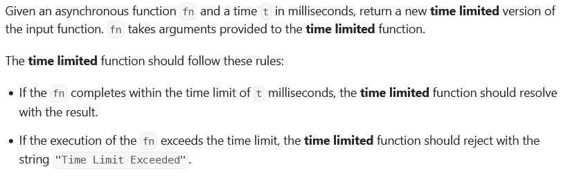 * const limited = timeLimit((t) => new Promise(res => setTimeout(res, t)), 100);