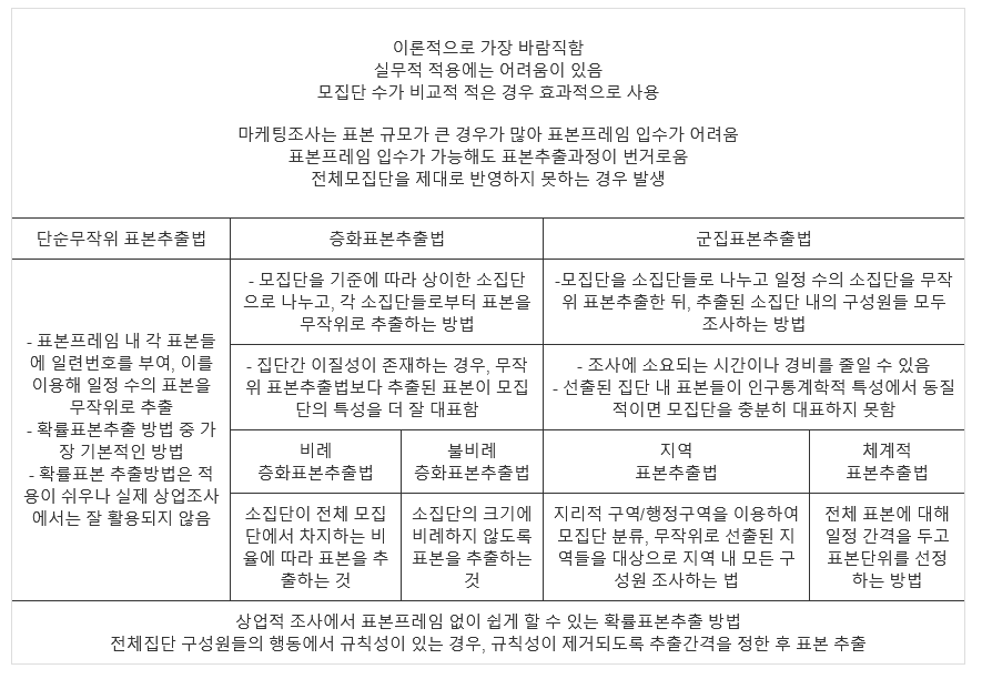 | 표본의 수가 많지않고 표본 프레임 입수가 가능한 경우 | 이용 | 모집단의 규모가 큰 경우 |